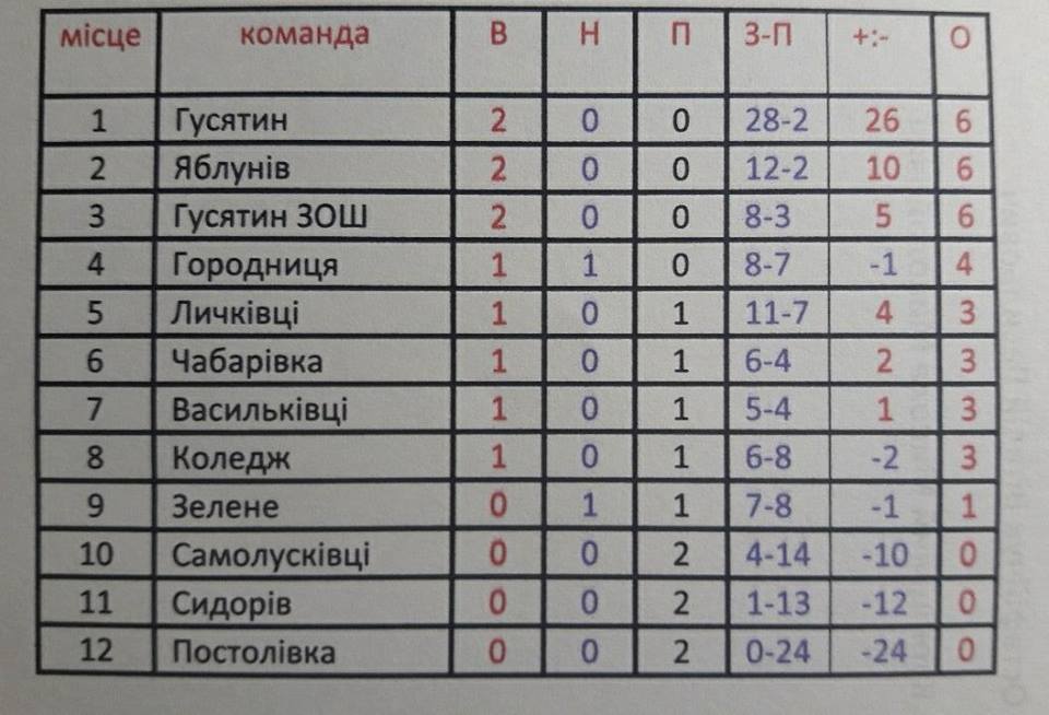 7. Гаврилюк, Турецький, Заяць (всі Личківці), Голик, Петрик, Литвин, Шимчишин (всі Самолусківці), Воробель, Печенога (всі Гусятин), Троян (ЗОШ), Шмигановський (ЗОШ), Добривода І., Добривода С., Данилків М., Янішевський (всі Зелене), Білінський (Чабарівка), Фок (Чабарівка), Ковальський В. (Городниця), Ковальський А. (Городниця) Пушкаренко, Безкоровайний, Паранюк (всі Васильківц), Логінов (Яблунів), Музика (Коледж), Свідерський С. (Сидорів) – 1.