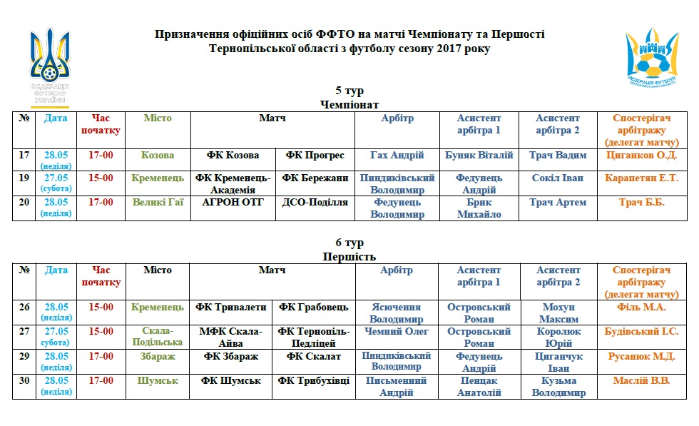 Призначення офіційних осіб ФФТО на поєдинки 27-28 травня