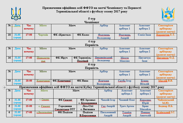 Призначення офіційних осіб на поєдинки чемпіонату та кубку області 31 травня