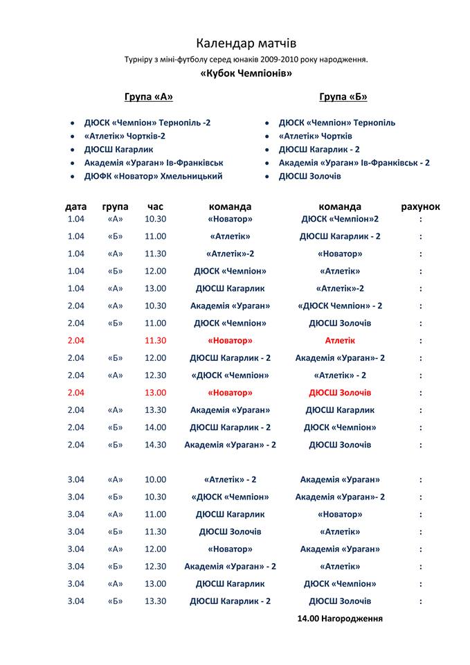 З 1 по 3 квітня у тернопільському спорткомплексі "Політехнік" відбудеться Всеукраїнський турнір з міні-футболу серед юнаків 2009-2010 років народження "Кубок Чемпіонів".