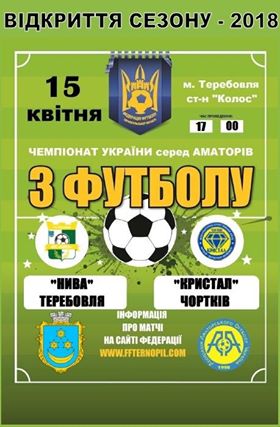 Сьогодні, 15 квітня, поновлюється аматорський чемпіонат України. І в першому ж матчі зустрічаються команди з Тернопільщини. У рамках 11-го туру в Теребовлі гратимуть місцева «Нива» та чортківський «Кристал». Початок матчу о 17 годині.