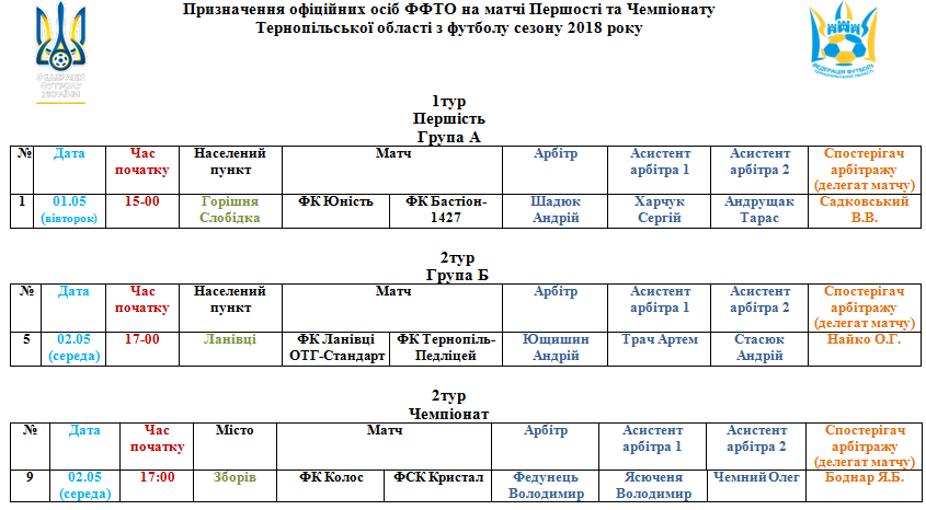 Призначення офіційних осіб ФФТО на матчі Першості та Чемпіонату Тернопільської області
