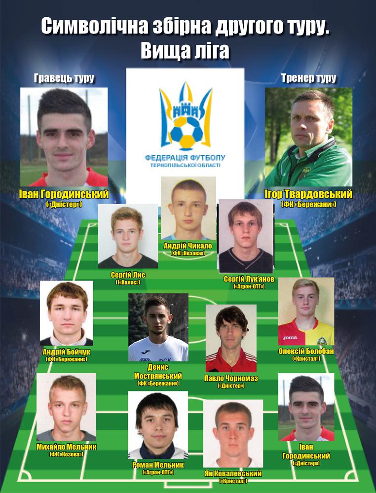 Федерація футболу Тернопільської області продовжує визначати кращих гравців у кожному турі. Пропонуємо до Вашої уваги символічну збірну другого туру вищої ліги чемпіонату області.