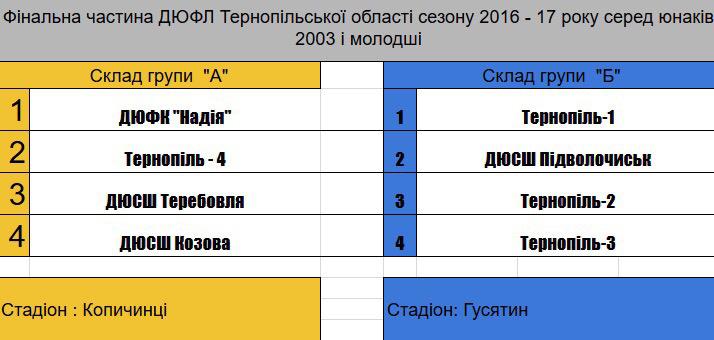 2017-06-11 07:58:48.00000012-13 червня відбудеться фінальна частина дитячо-юнацької футбольної ліги Тернопільської області сезону-2016/17 серед юнаків 2003 р.н. і молодших. Футбольні поєдинки відбуватимуться на стадіонах Гусятина та Копичинців.