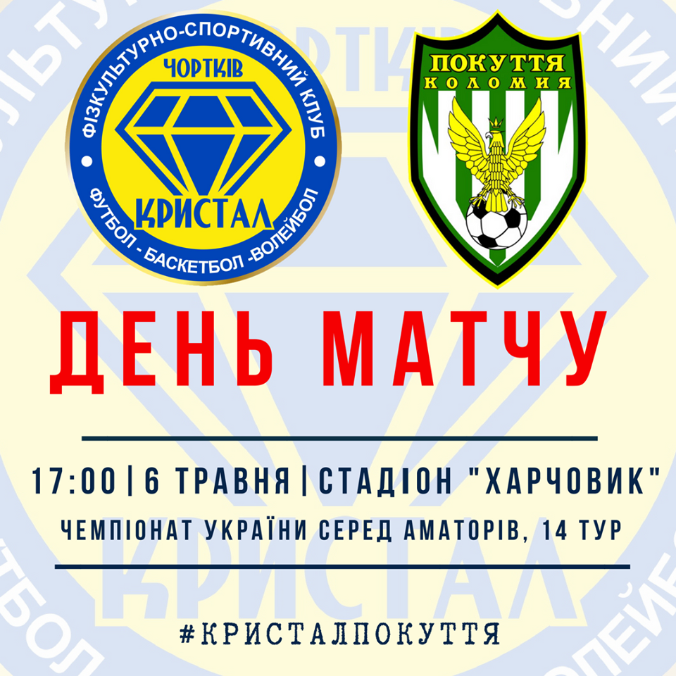 Сьогодні, 6 травня, у 14-му турі чемпіонату України серед аматорів чортківський «Кристал» на домашній арені гратиме проти «Покуття» з Коломиї (Івано-Франківська область). Зважаючи на невдалий старт «Кристала» у весняній частині сезону – три поразки в трьох матчах, ця зустріч має надзвичайну вагу для чортківської команди та їхнього тренера Віктора Дубіно.