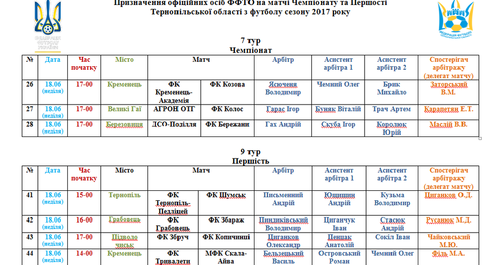 Призначення офіційних осіб ФФТО на матчі Кубка Тернопільської області з футболу сезону 2017 року