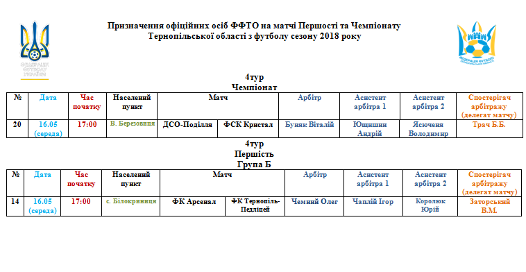 Призначення офіційних осіб ФФТО на матчі 16 травня