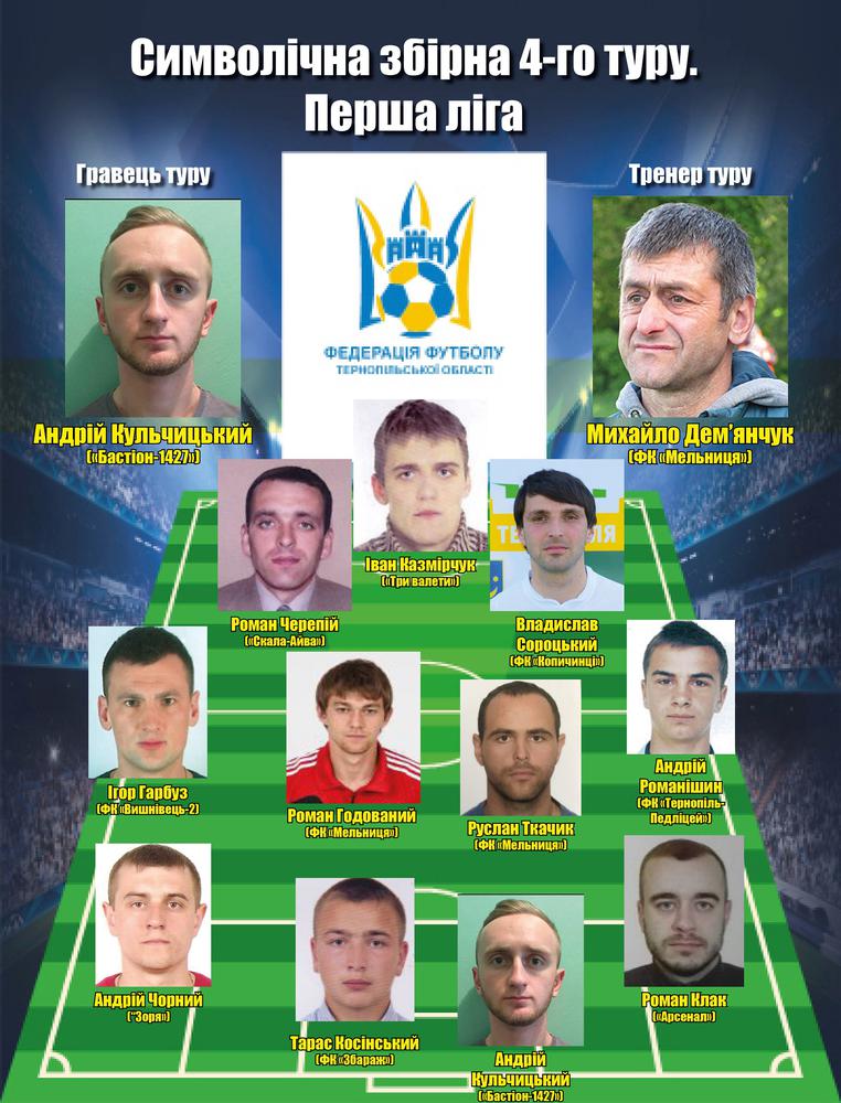 2018-05-18 11:03:16.000000Пропонуємо на розсуд вболівальників та учасників футбольних баталій символічну збірну 4-го туру першої обалсної ліги за версією Федерації футболу Тернопільської області, яку ми створили на основі опитувань футбольних фахівців, журналістів, спостерігачів ФФТО та глядачів...