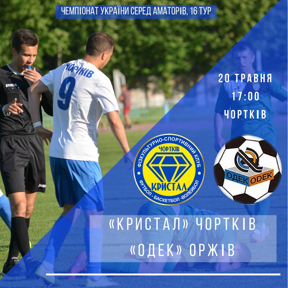 Шостої поспіль весняної поразки в аматорському чемпіонаті України зазнав чортківський «Кристал». Сталося це в Чорткові в рамках 16-го туру. Наші земляки поступилися одному з лідерів – ОДЕКу з Оржева (Рівненська область) – 0:1.