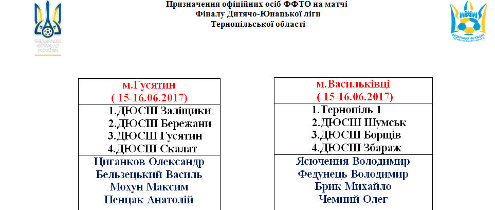 Призначення офіційних осіб ФФТО на матчі Фіналу Дитячо-Юнацької ліги Тернопільської області