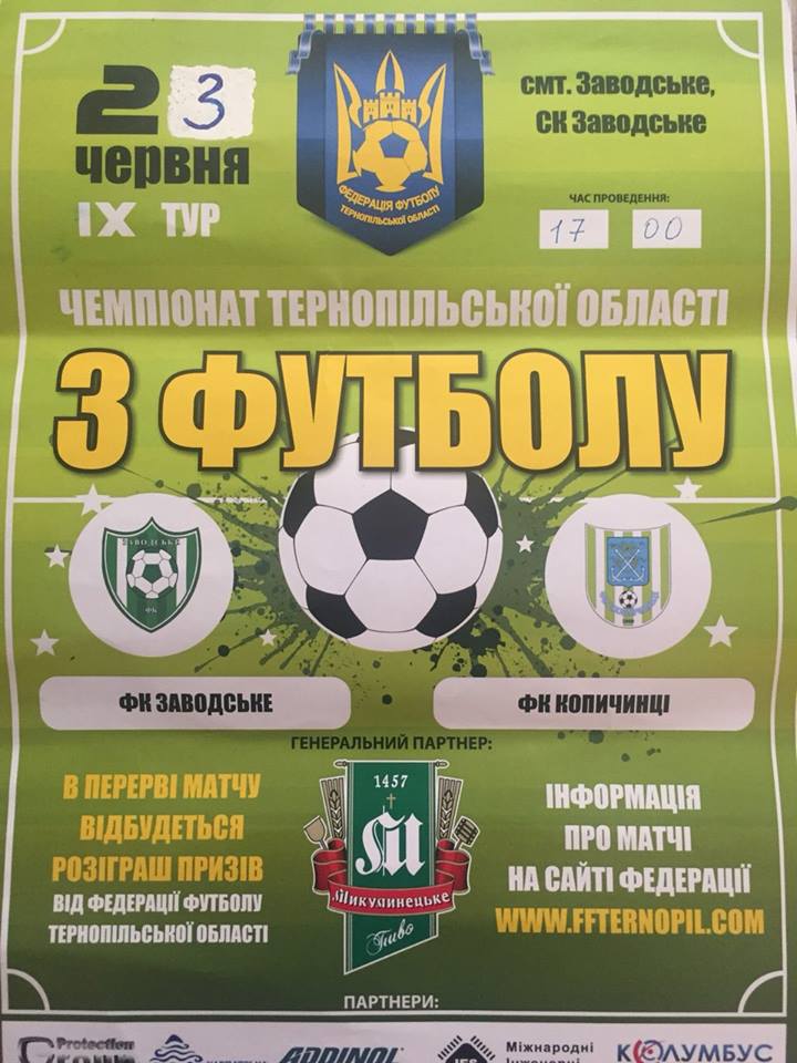 Сьогодні, 23 червня, в обласному футболі відбудеться один матч, але який… У центральному поєдинку 9-го туру в групі «А» першої ліги зустрінуться лідери – ФК «Заводське» (Чортківський район) та ФК «Копичинці» (Гусятинський район).