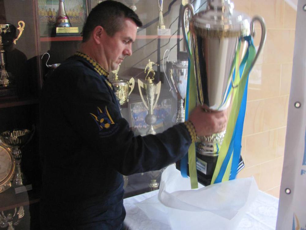 Виконавчий директор ФФТО Василь Заторський прикріплює гравірування на суперкубок 2018 року.