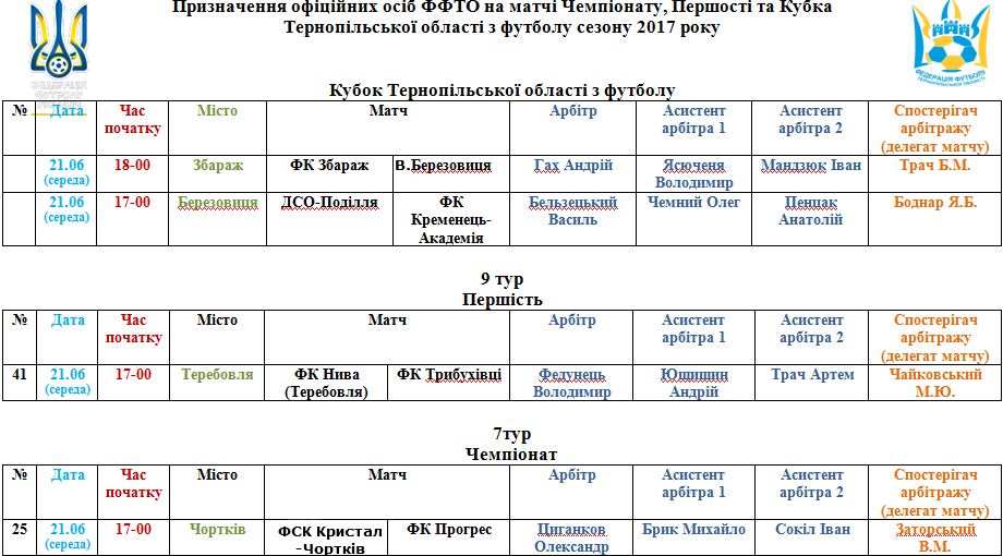 Призначення офіційних осіб ФФТО на матчі Чемпіонату, Першості та Кубка Тернопільської області з футболу сезону 2017 року