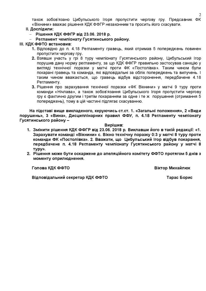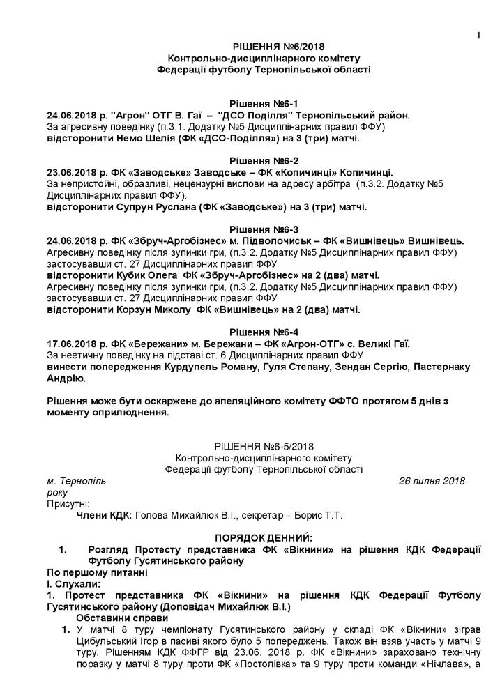 Рішення КДК Федерації футболу Тернопільської області №6/2018