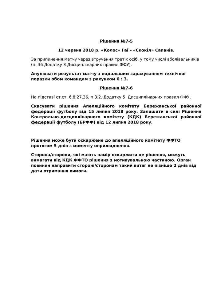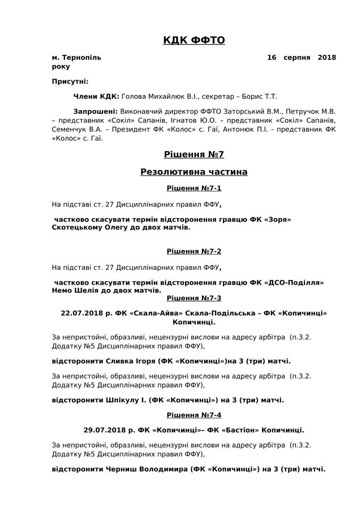 Рішення КДК Федерації футболу Тернопільської області №7/2018