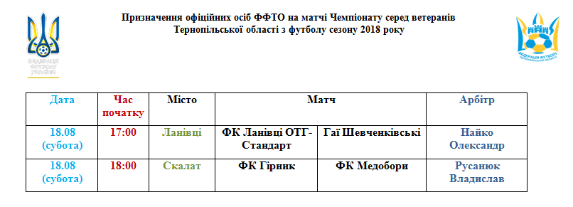 Призначення офіційних осіб ФФТО на матчі Чемпіонату серед ветеранів Тернопільської області з футболу сезону 2018 року
