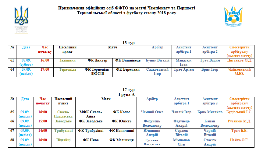 Призначення офіційних осіб ФФТО на матчі 08-09 вересня