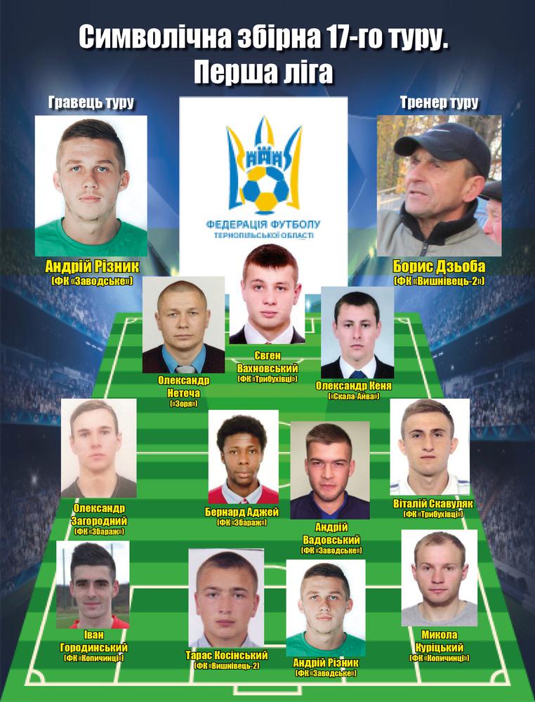 2018-09-14 17:34:06.00000012 вересня відбувся останній матч 17-го туру першої ліги чемпіонату Тернопільської області (ФК "Тернопіль-Педліцей" – ФК "Збараж"), відповідно можна представити на розсуд тернопільським вболівальникам символічну збірну туру.
