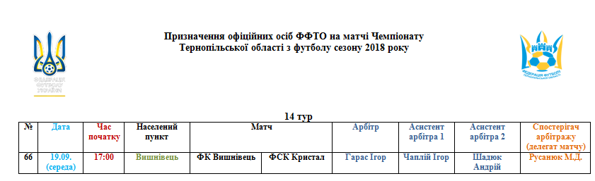 Призначення офіційних осіб ФФТО на матч 19 вересня