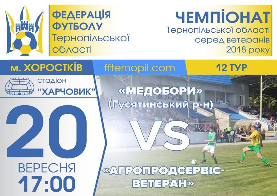 2018-09-19 07:40:22.000000Завтра, 20 вересня, у Хоросткові на стадіоні «Харчовик» відбудеться пропущений матч 12-го туру чемпіонату Тернопільської області серед ветеранів (40 років і більше).