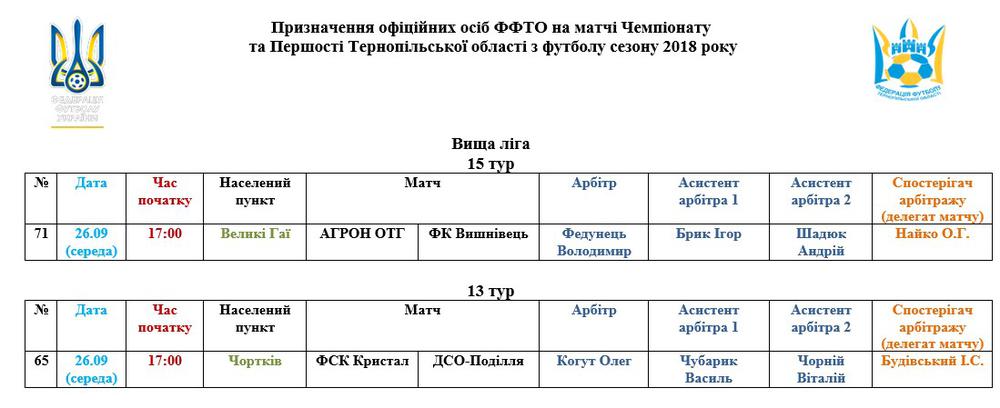 Призначення офіційних осіб ФФТО на матчі 26 вересня