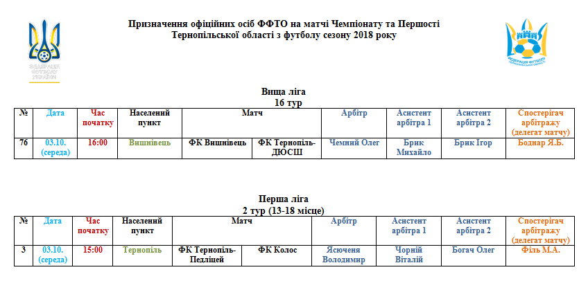 Призначення офіційних осіб ФФТО на матчі 03 жовтня
