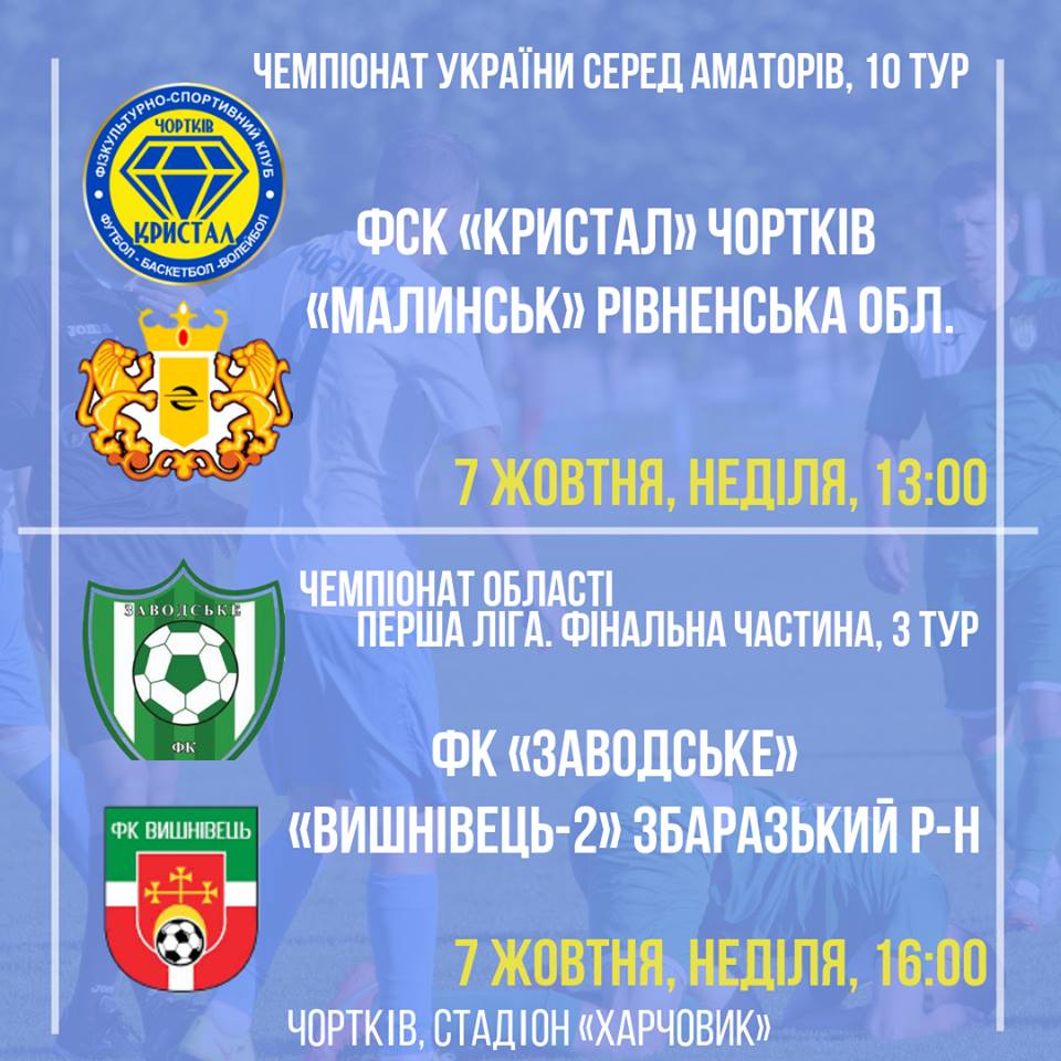 О 13 годині в рамках 10-го туру чортківському "Кристалу" протистоятиме одноосібний лідер чемпіонату України серед аматорів – ФК "Малинськ" із Рівненщини. А вже о 16 годині ФК "Заводське" прийматиме "Вишнівець-2" із Збаражчини у рамках 3-го туру фінальної частини першої ліги Чемпіонату області.