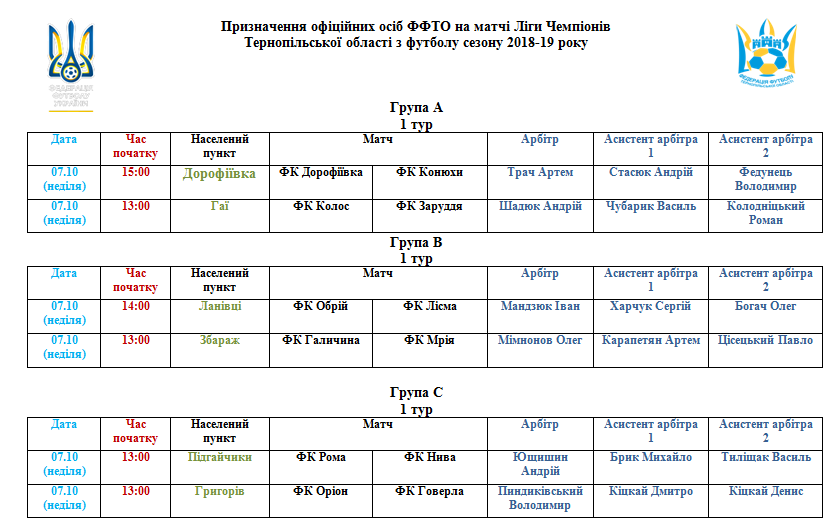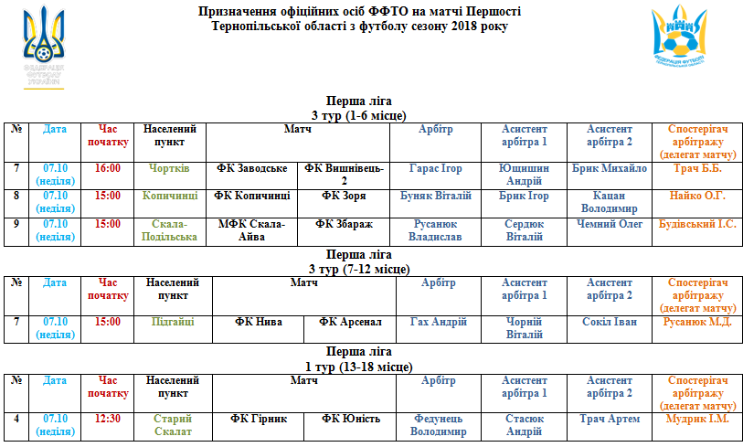 Призначення офіційних осіб ФФТО на матчі 07 жовтня