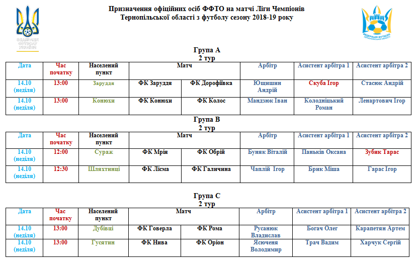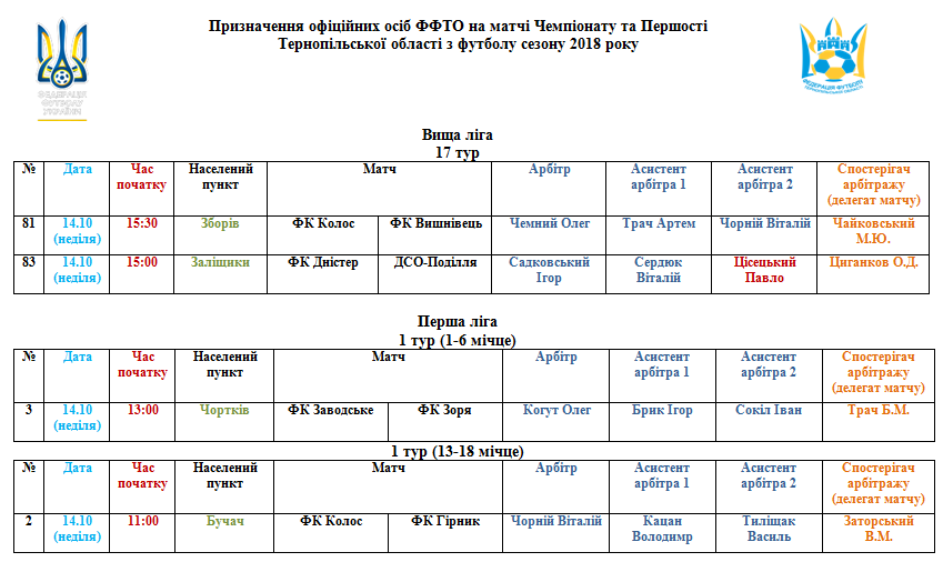 Призначення офіційних осіб ФФТО на матчі 14 жовтня