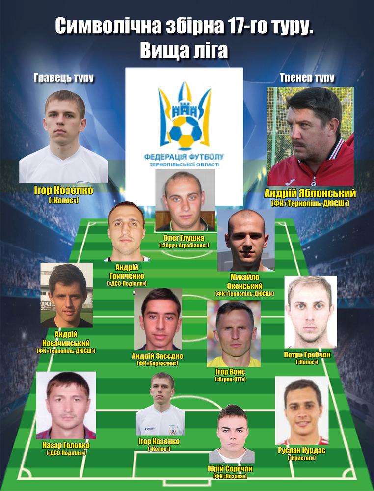 Вчора, 17 жовтня, відбулися заключні матчі 17-го туру вищої ліги чемпіонату Тернопільської області, а тому пропонуємо до Вашої уваги символічну збірну туру.