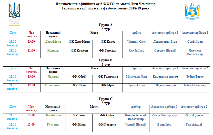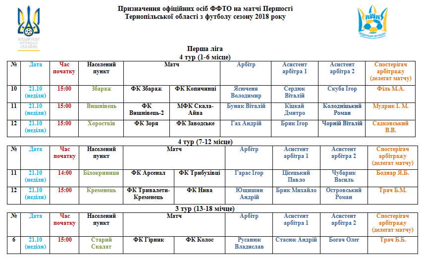 Призначення офіційних осіб ФФТО на матчі 21 жовтня