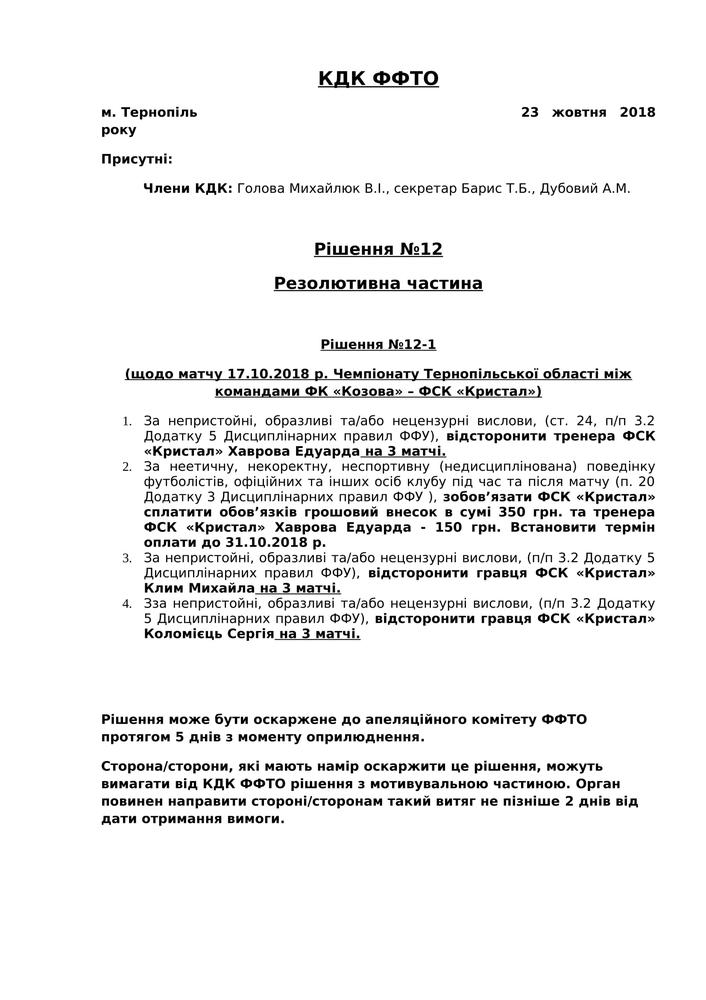 Рішення КДК Федерації футболу Тернопільської області від 23.10.2018 р.