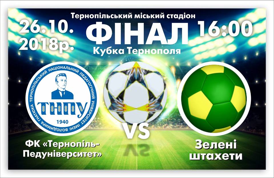 Завтра, 26 жовтня, на Тернопільському міському стадіоні відбудеться фінальний поєдинок за кубок Тернополя 2018 року, який проходить під патронатом міського голови Сергія Надала.
