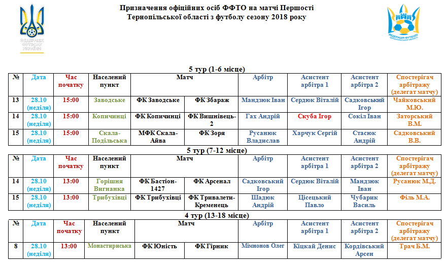 Призначення офіційних осіб ФФТО на матчі 28 жовтня