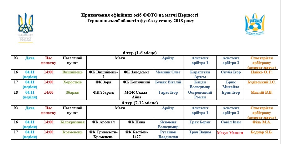 Призначення офіційних осіб ФФТО на матчі 04 листопада