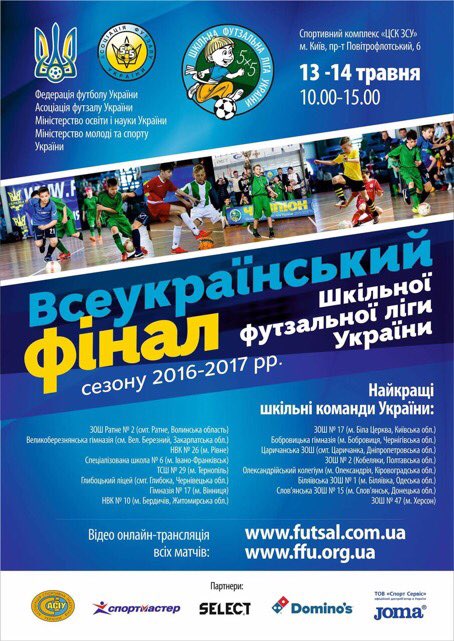 13 та 14 травня у Києві у двох залах спорткомплексу ЦСК ЗСУ (пр. Повітрофлотський, 6) відбудуться матчі Всеукраїнського фіналу Шкільної футзальної ліги України.