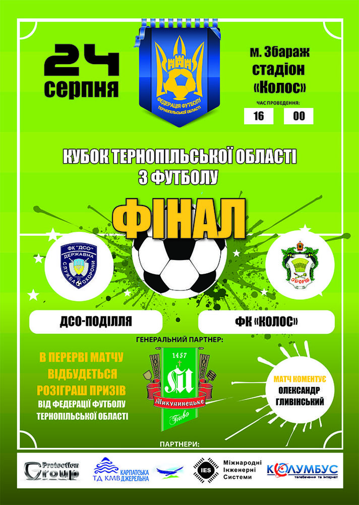 24 серпня у Збаражі відбудеться фінальний поєдинок кубку Тернопільської області з футболу 2017 року. У ньому зустрінуться команди "ДСО-Поділля" (Тернопільський район) та "Колос" (Зборів). Всіх любителів футболу запрошуємо відвідати цікаве футбольне дійство.