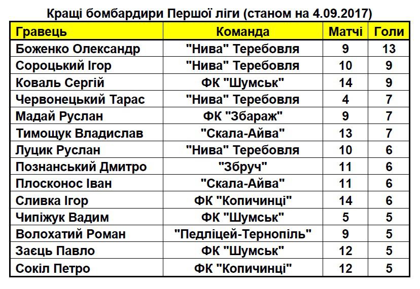 Пропонуємо до Вашої уваги список кращих бомбардирів першої ліги чемпіонату Тернопільської області з футболу станом на 4 вересня.