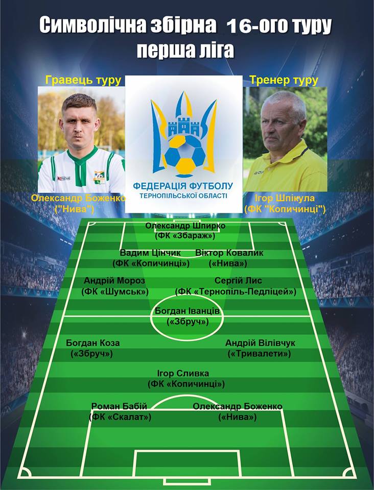 Пропонуємо до Вашої уваги символічну збірну 16-го туру першої ліги чемпіонату Тернопільської області з футболу 2017 року.