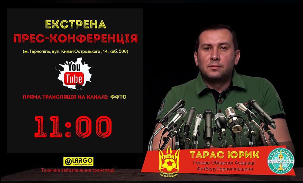 У четвер, 28 травня, починаючи з 11.00 у приміщенні Асоціації футболу Тернопільщини (м. Тернопіль, вул. Князя Острозького ,14, каб. 506) відбудеться прес-конференція голови обласної Асоціації футболу Тараса Зіновійовича Юрика на тему: «Чому у Львові, а не Тернополі відбудеться фінал кубку України з футболу сезону-2019/20?»