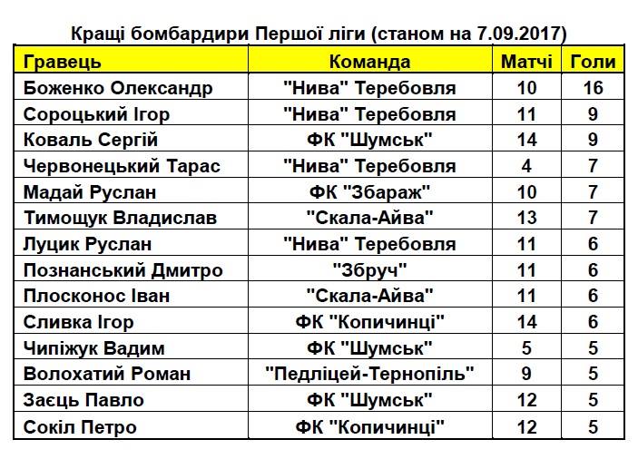 2017-09-08 08:25:30.000000Пропонуємо до Вашої уваги список кращих бомбардирів першої ліги чемпіонату Тернопільської області з футболу станом на 7 вересня.