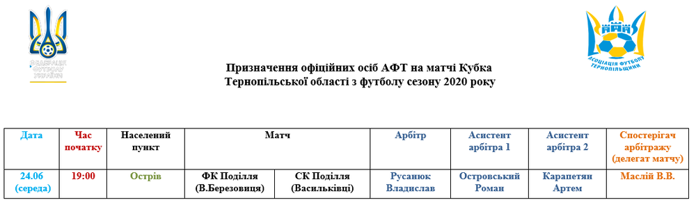 Призначення офіційних осіб АФТ на матчі Кубка Тернопільської області з футболу сезону 2020 року