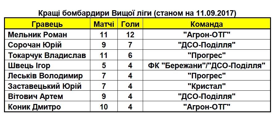 2017-09-11 11:48:05.000000Пропонуємо до Вашої уваги список кращих бомбардирів вищої ліги чемпіонату Тернопільської області з футболу станом на 11 вересня.