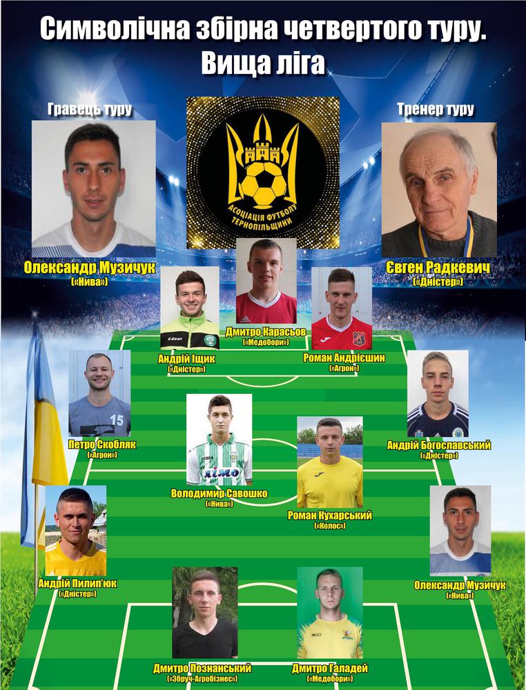 Пропонуємо до Вашої уваги символічну збірну четвертого туру вищої ліги чемпіонату Тернопільської області 2020 року за версією Асоціації футболу Тернопільщини.