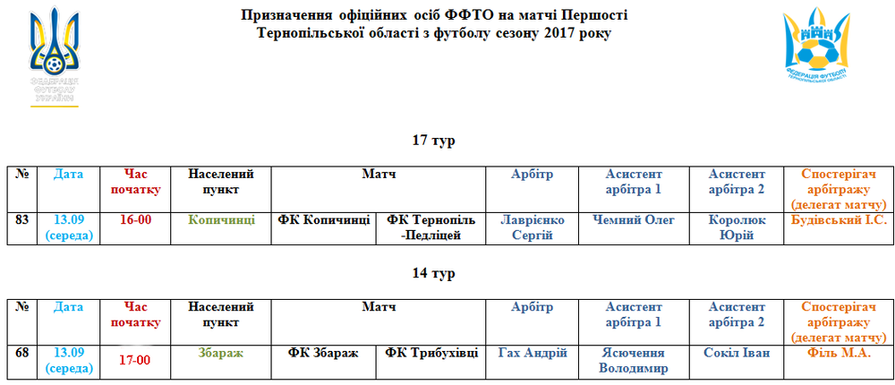 Призначення офіційних осіб ФФТО на матчі Першості Тернопільської області з футболу сезону 2017 року