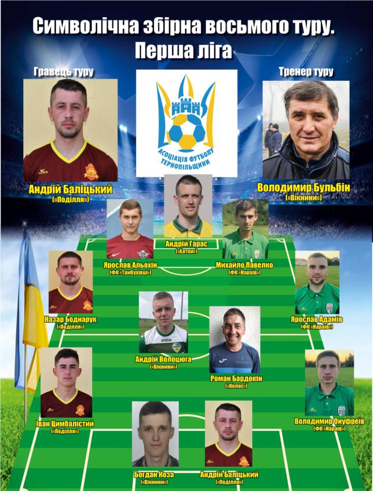 Пропонуємо до Вашої уваги символічну збірну восьмого туру першої ліги чемпіонату Тернопільської області 2020 року за версією Асоціації футболу Тернопільщини.