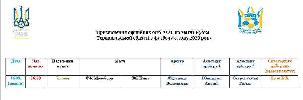 ПРИЗНАЧЕННЯ ОФІЦІЙНИХ ОСІБ АФТ НА МАТЧ 16 СЕРПНЯ