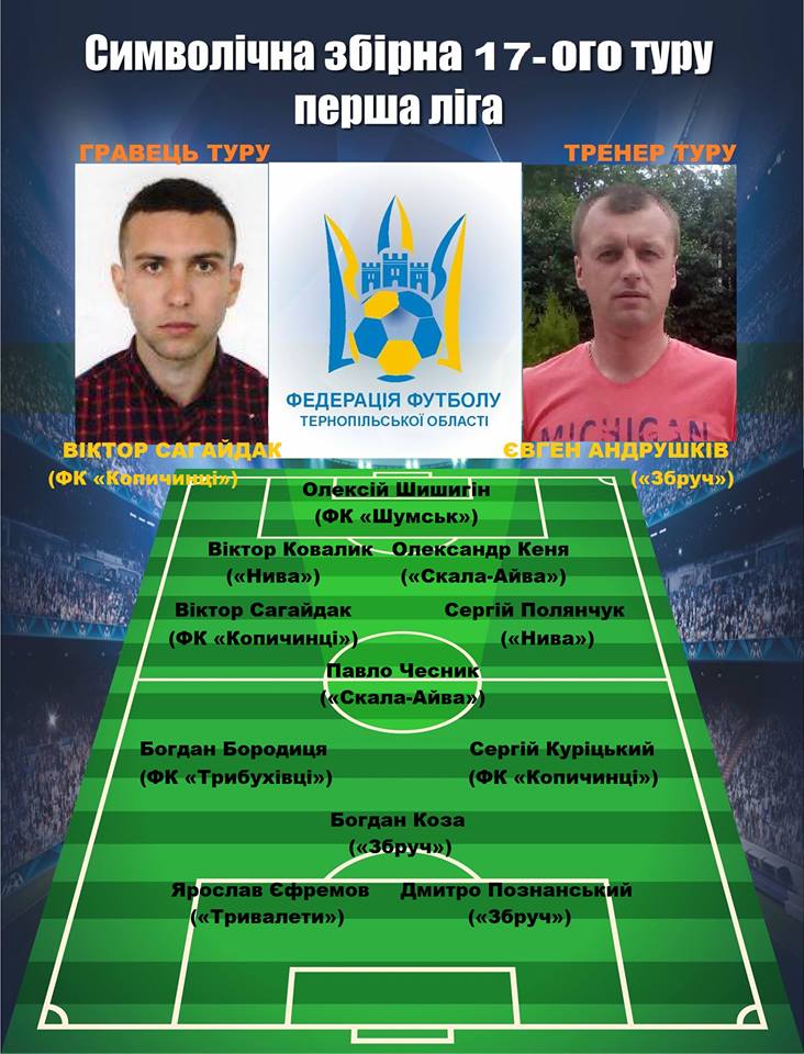 Пропонуємо до Вашої уваги символічну збірну 17-го туру першої ліги чемпіонату Тернопільської області з футболу 2017 року.