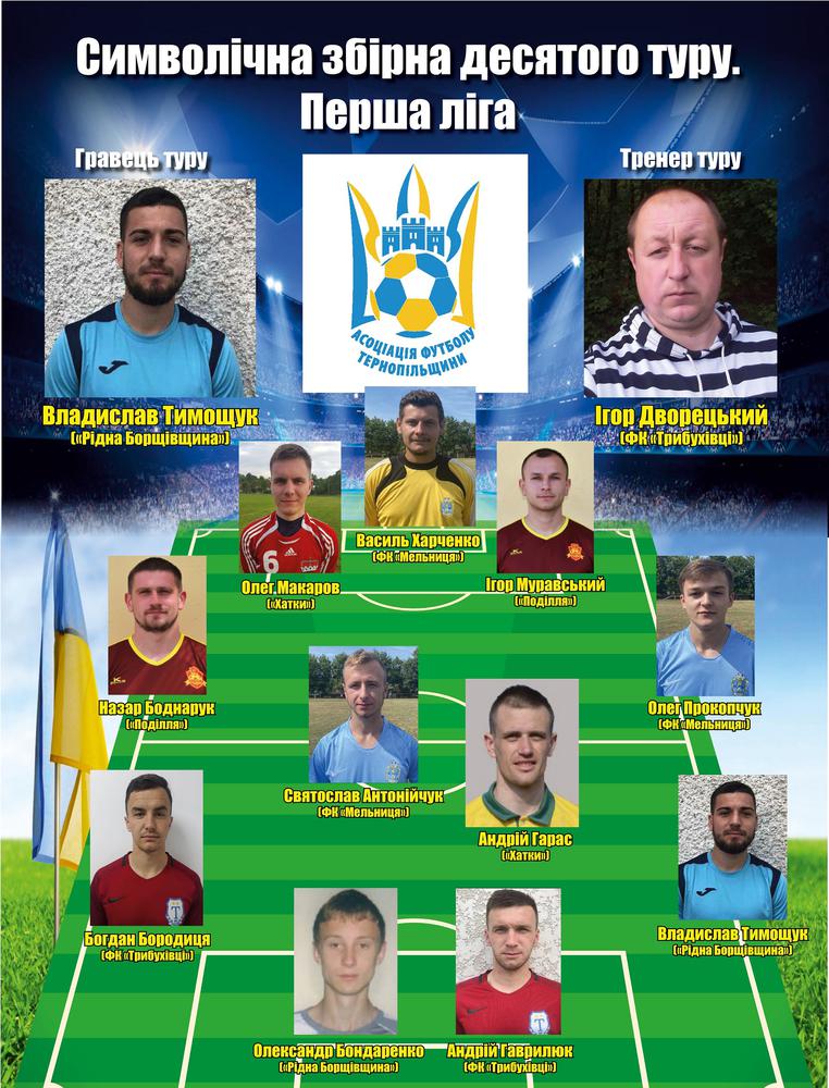 Пропонуємо до Вашої уваги символічну збірну десятого туру першої ліги чемпіонату Тернопільської області 2020 року за версією Асоціації футболу Тернопільщини.
