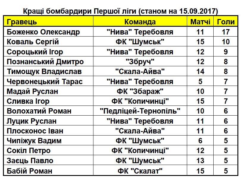 2017-09-15 10:03:12.000000Пропонуємо до Вашої уваги список кращих бомбардирів першої ліги чемпіонату Тернопільської області з футболу станом на 15 вересня.